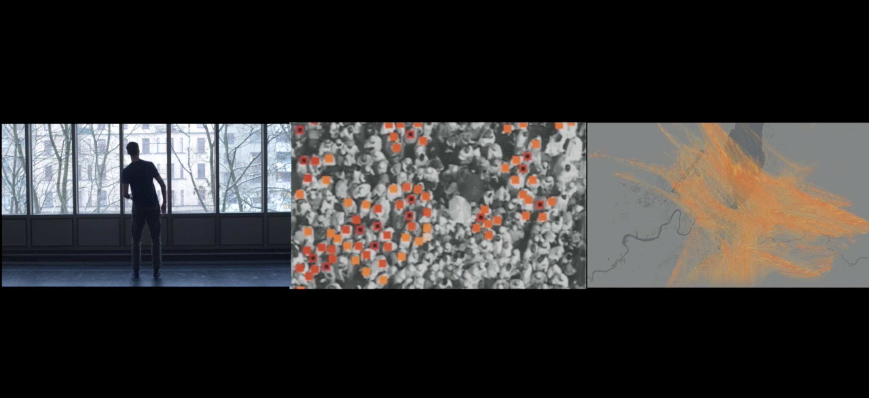 The film addresses the aesthetics and politics of these softwares and tracking system where these digital tools used for monitoring todays crowd flows and behaviour are becoming increasingly political while facing ethical dilemmas.